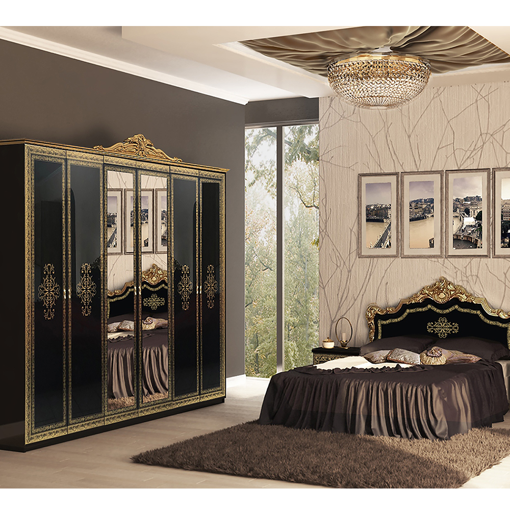 Комплект включает шкаф с шестью дверями и зеркалом, комод с тремя ящиками, две закрытые тумбочки с двумя ящиками каждый и дополнительное зеркало. Все элементы изготовлены из высококачественного ДСП ламинированного толщиной 16мм для устойчивости и прочности. Фасады с трехслойным высокоглянцевым покрытием создают изящный вид и защищают мебель от повреждений.