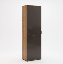 Фурнитура шкафа включает в себя алюминиевую профильную ручку, которая придает вид современности и элегантности. Пластиковая ножка, покрытая сатином под цвет ручки, обеспечивает устойчивость и равномерное распределение веса шкафа. Металлические крепления и противоскользящие держатели гарантируют надежную конструкцию и предотвращают повреждения.