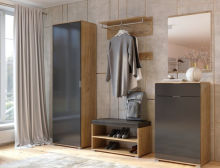 Задняя стенка шкафа изготовлена из ДСП, что дает дополнительную прочность и устойчивость конструкции. Цвет шкафа – дуб крафт, матовая скамья, создающая спокойную и стильную атмосферу в интерьере.