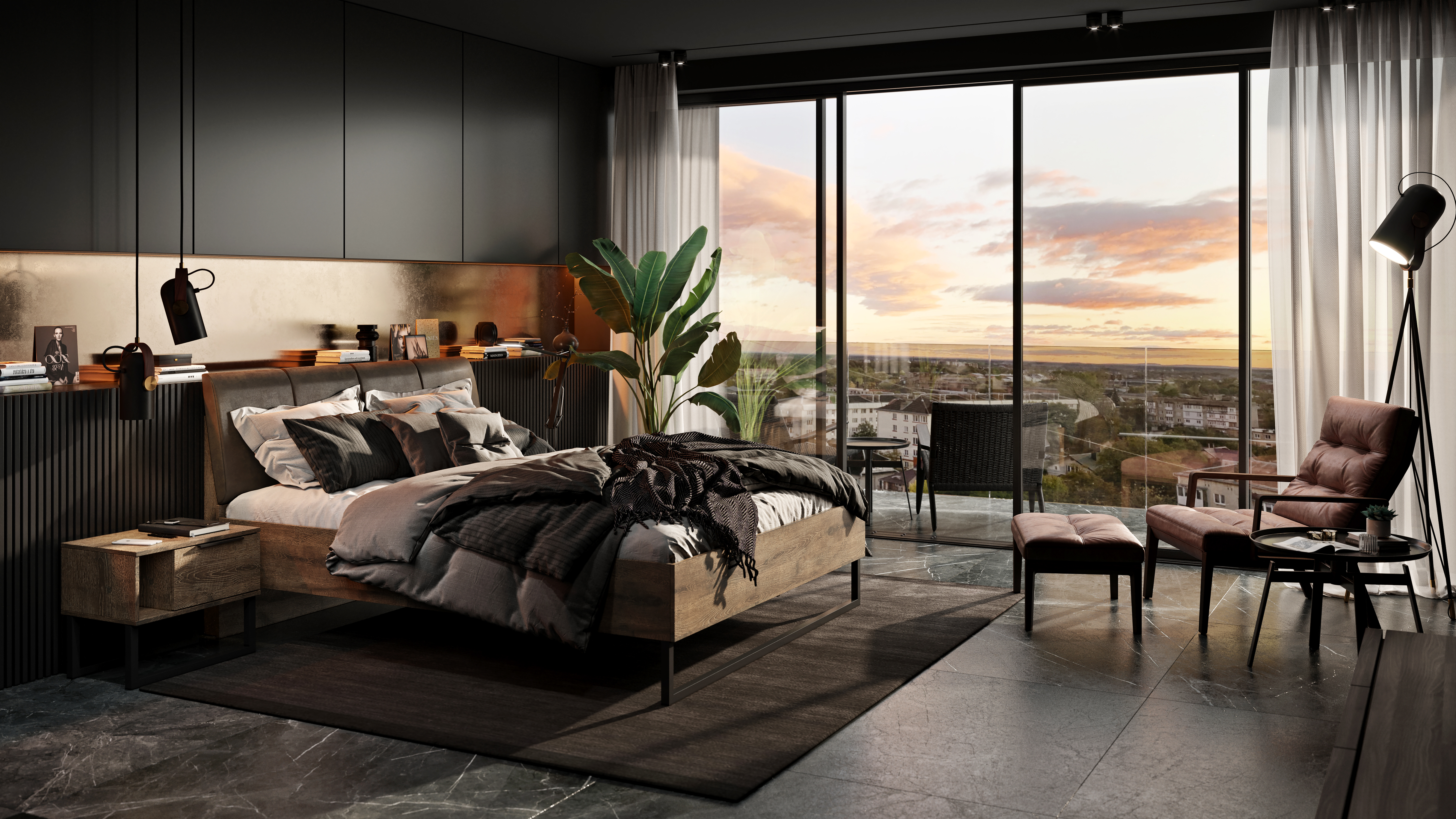 Features include the bed head with ATLANTA 7 furniture fabric, which is easy to care for and has high wear resistance with a 30,000 cycle Martindale test. The bed supports are made of thick black metal in the Loft style.