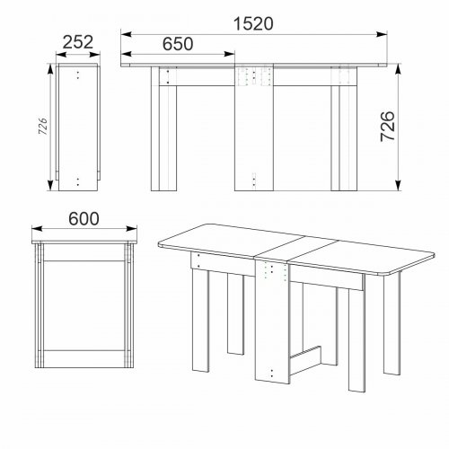 С высотой 726 мм, этот стол-книга идеально подходит для работы или ужина, а также для отдыха. Он имеет стандартную ширину 600 мм, что позволяет легко вписать его в любой интерьер. Однако его глубина может изменяться от 252 мм до 1520 мм благодаря сложной системе раскладывания, что придает ему уникальную функциональность. Эта возможность позволяет сэкономить место в комнате, когда стол не используется, и развернуть его, когда нужно больше пространства для работы или приема гостей.