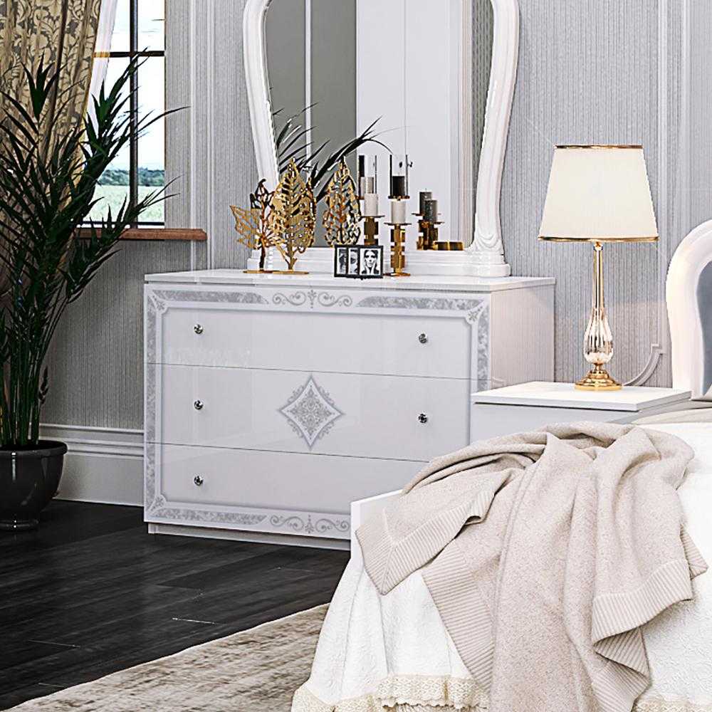 Білий глянець корпусів, фасадів і стільниць надає елегантності і стилю, а світло-сірий велюр створює атмосферу теплоти і спокою в спальні. М'яке узголів'я ліжка виконано з високоякісних матеріалів, що забезпечують довговічність і комфорт.