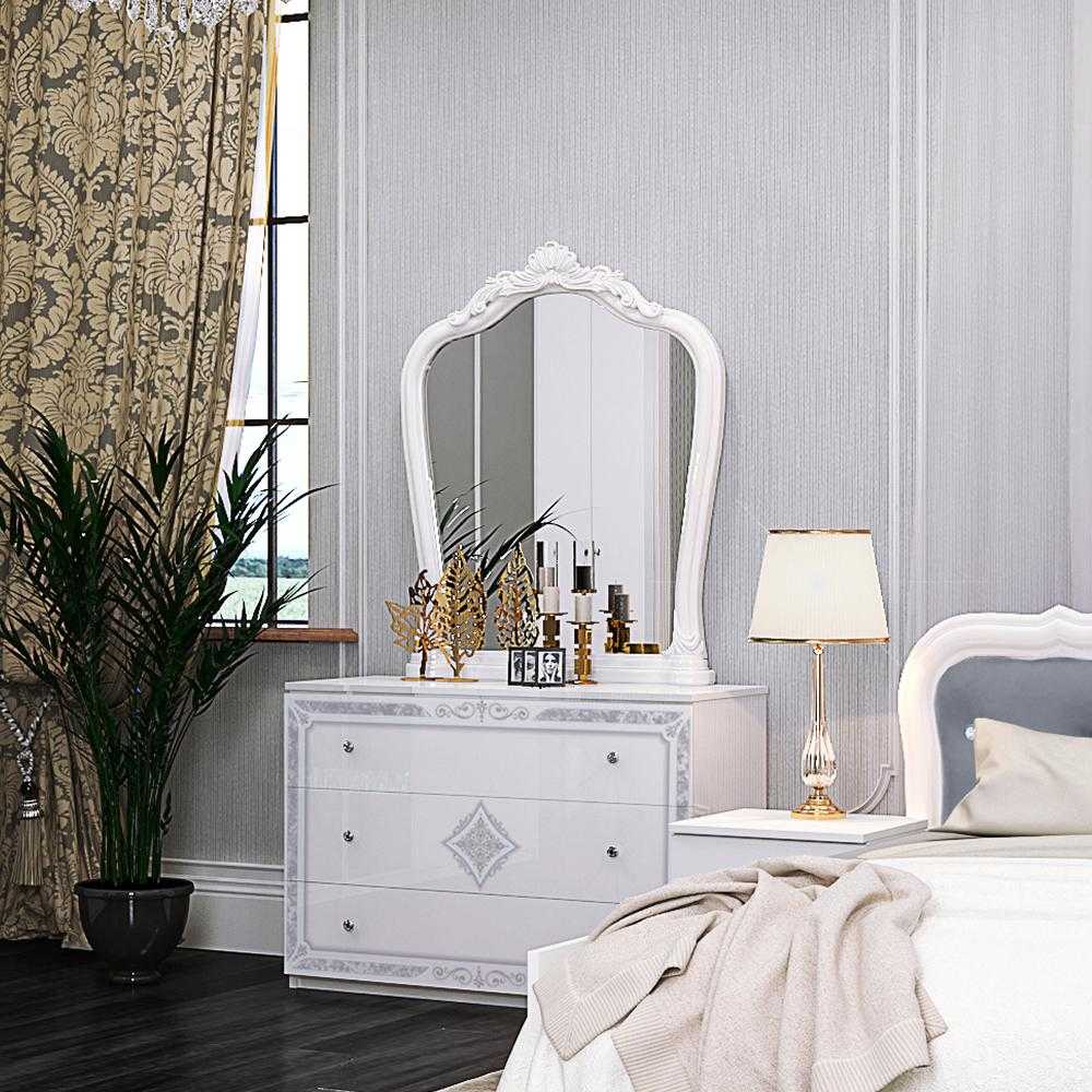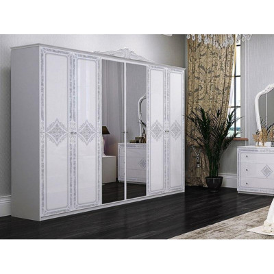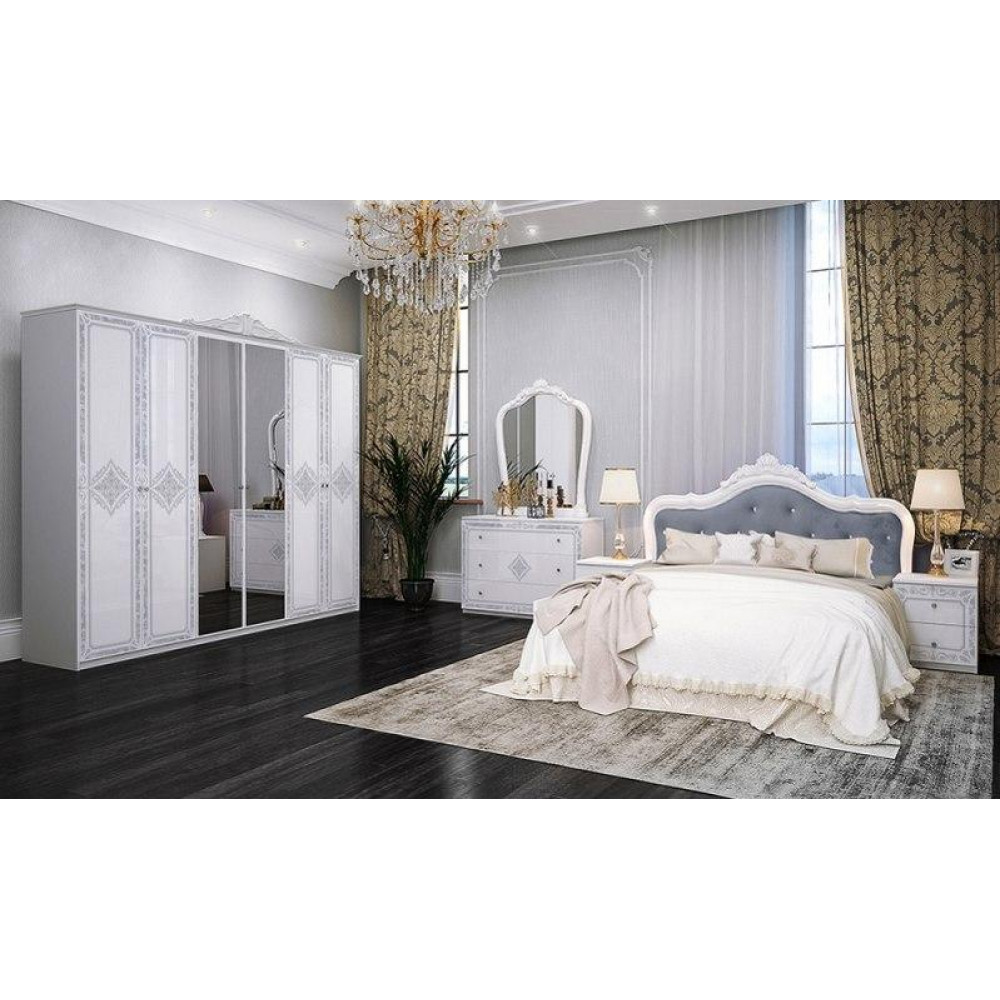 У цьому комплекті все необхідне: шафа з шістьма дверима, дві тумби, комод і дзеркало без корони, виготовлені з надійної ЛДСП. Кожен елемент оснащений металевою фурнітурою, що забезпечує зручність використання: металева кругла ручка з гвинтом і стразами, антивывижные полки і ексцентрикові стяжки для з'єднання деталей.