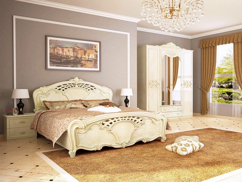 Комплектація включає чотиридверну шафу з дзеркалом, чотириярусний комод, дві тумбочки з двома ящиками і дзеркало. Фасади, Корпуси і тумби виготовлені з ламінованої ДСП Kronospan, Swisskrono, Swisspan, а також з високоякісної ЛДСП, що гарантує міцність і довговічність меблів.
