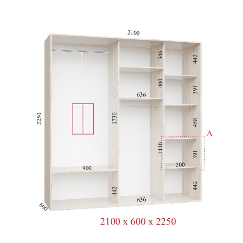 Завдяки своїм компактним розмірам 210х60х225, він ідеально впишеться навіть в невеликі кімнати, не займаючи зайвого місця. Разом з тим, шафа-купе забезпечує достатньо простору для зберігання вашого одягу, взуття та аксесуарів, завдяки зручним полицям, ящикам і вішалкам. Шафа-купе Люкс привертає увагу своїми двома фасадами, які дозволяють легко організувати доступ до ваших речей.