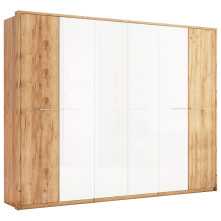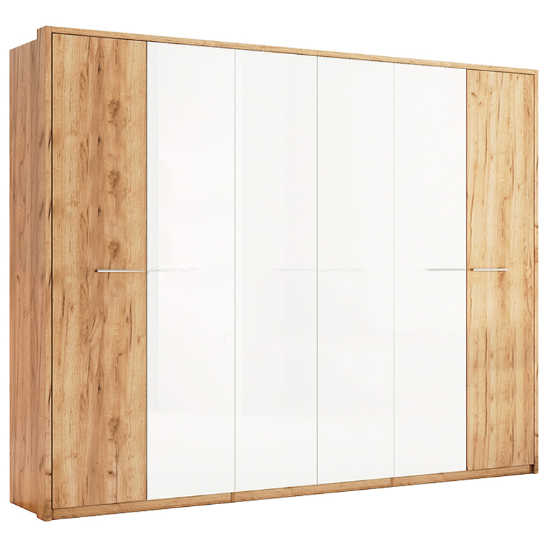 Шафа має шість дверей, що дозволяє зручно організувати простір для зберігання речей. Колір корпусу шафи-Дуб крафт, а фасад – Дуб крафт в поєднанні з білим глянцевим покриттям. Це стильне поєднання кольорів надає шафі елегантність і візуально збільшує простір в кімнаті.