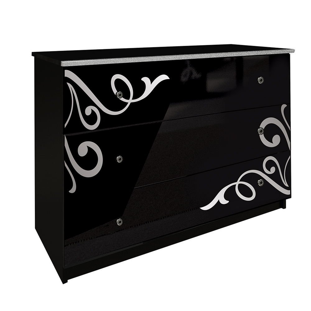 Комод доступний в двох кольорах-білому і чорному глянці, які підкреслюють сучасний стиль і надають елегантності інтер'єру. Корпус комода виготовлений з високоякісного ламінованого ДСП, яке пройшло спеціальну обробку ультрафіолетовими променями, що забезпечує його довговічність і стійкість до механічних пошкоджень. Фасад комода оформлений шовкографією з ефектом срібного мерехтіння, що надає йому ексклюзивність і розкіш.