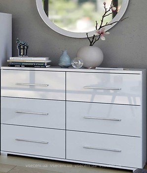 Комод виконаний в модному білому глянсовому кольорі, який надає свіжості і стильності вашому інтер'єру. Цей колірний варіант гармонійно поєднується з будь-якими квітами меблів і декору. Блискуча поверхня візуально збільшує простір кімнати і робить його більш світлим і привітним.
