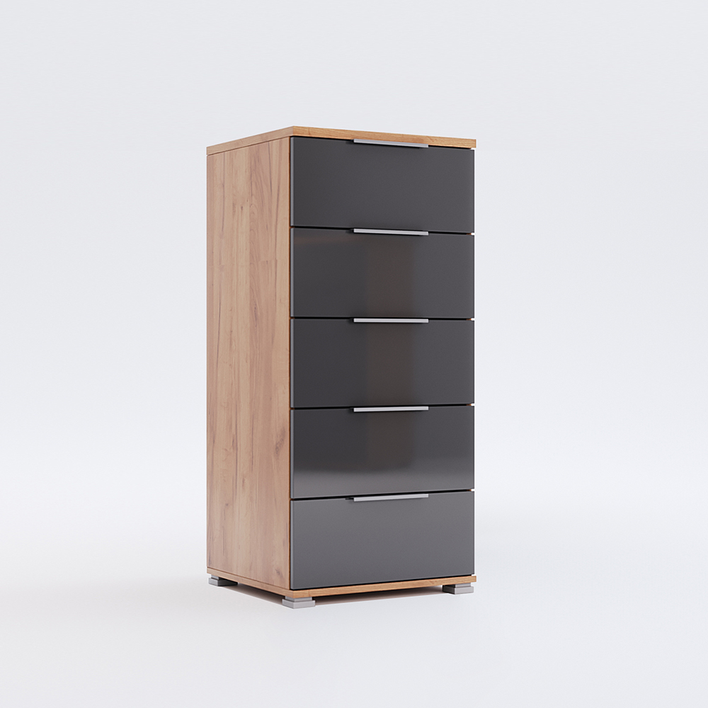 Комод має п'ять ящиків, що дозволяє зберігати в них різні речі: від одягу і білизни до книг і всіляких дрібниць. Корпус виконаний з ламінованої ДСП товщиною 16 мм, а фасад має модне тришарове високоглянцеве покриття, висушене під ультрафіолетовими променями. Це робить комод стильним і елегантним елементом інтер'єру.