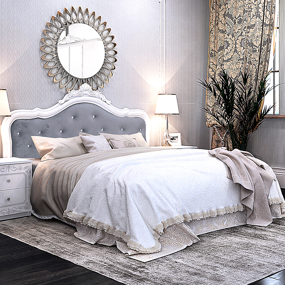 Колір велюру цього ліжка-світло-сірий. Ліжко виробляється в Україні, а матеріал каркаса включає в себе ДСП і велюр. Оббивка також зроблена з велюру, а узголів'я ліжка має м'яку структуру. Матрац купується окремо від ліжка, ніша для білизни відсутня, а підйомний механізм теж не передбачений.