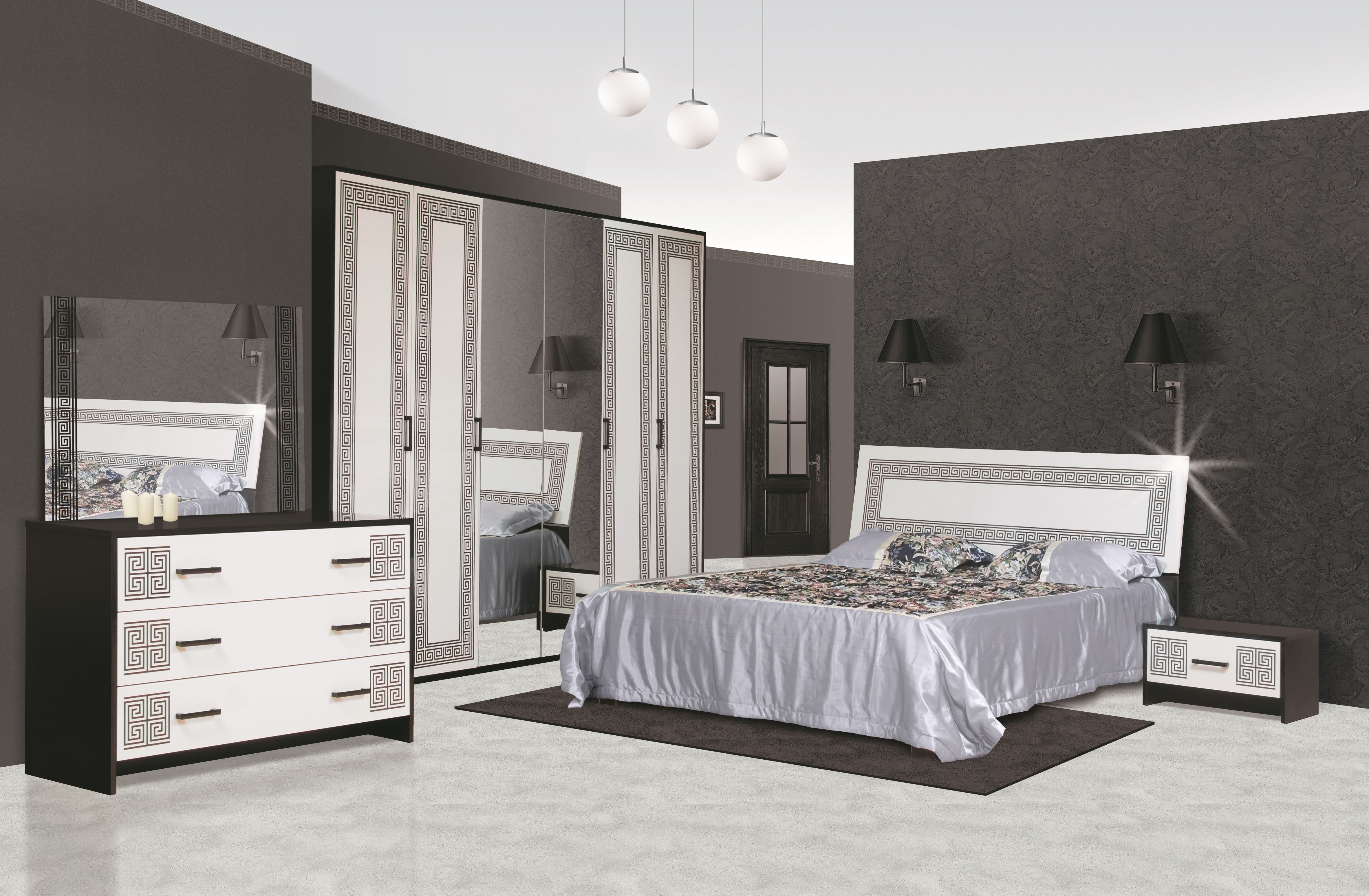 Невід'ємною частиною спальні є шафа з шістьма дверима, розмір якої становить 2725 на 2125 мм, а ширина – 605 мм. Корпус шафи виконаний у чорному кольорі з ДСП, що надає йому стійкості та довговічності. Фасади шафи виготовлені з білого лакованого ДСП з художнім друком, що надає елегантності та оригінальності дизайну.