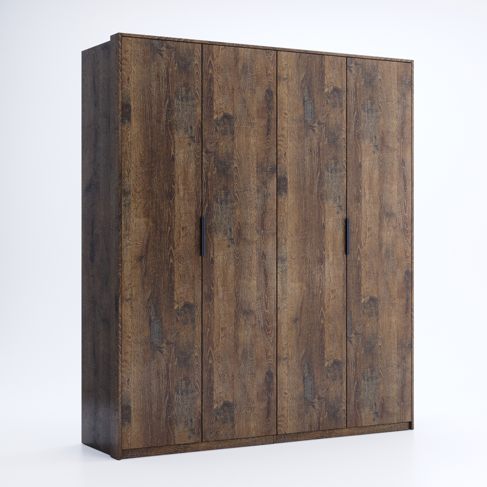 Четыре двери ДСП, включая два зеркала, делают помещение зрительно более просторным. В комплект входят две стильные тумбочки, комфортные упоры для кровати, изготовленные из толстого черного металла в стиле "Лофт". Их фурнитура, включая профильную ручку из черного алюминиевого материала, придает элегантности и практичности.