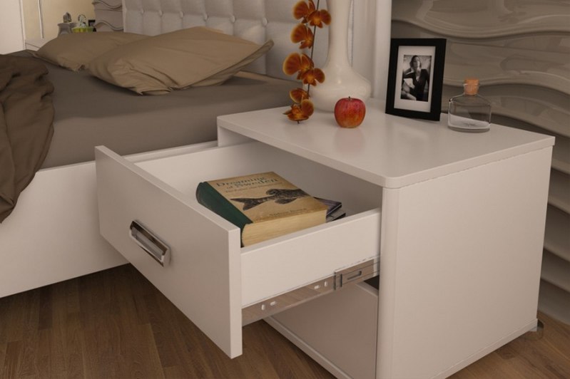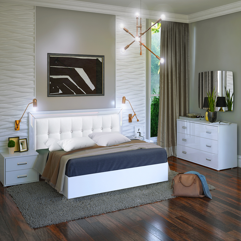 Глянец белого цвета придает простору и светлости, создавая ощущение легкости в помещении. Кровать без каркаса с мягкими вставками – это уютное спальное место, придающее теплу и комфорту.