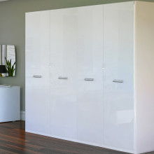 В этой спальне есть четыре двери и четыре ящика, которые идеально вписываются в белый глянцевый корпус. Особая вставка изголовья кровати бежевого цвета с двумя вертикальными линиями придает ему элегантность.