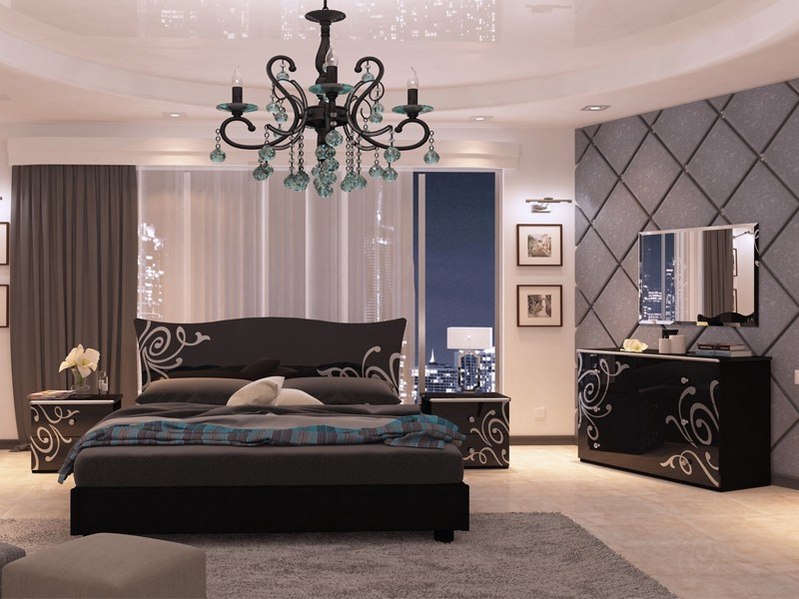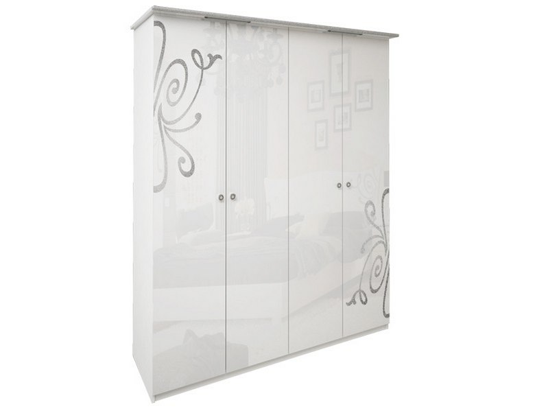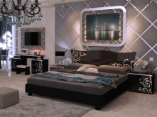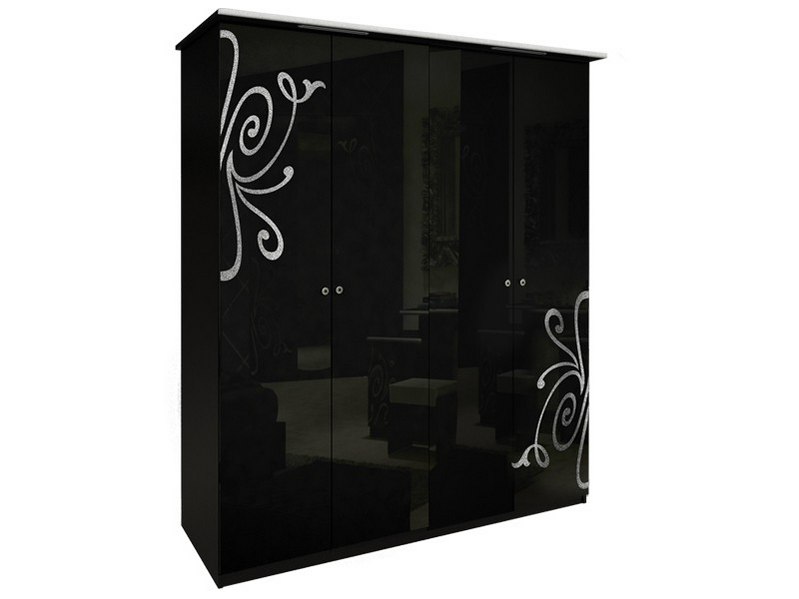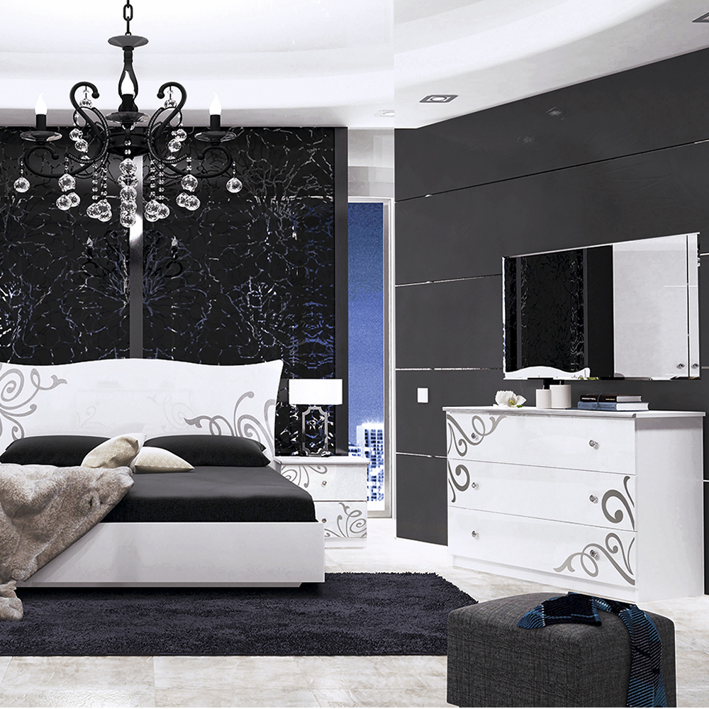 Задняя стенка выполнена из хардфайбера (ХДФ), что обеспечивает дополнительную прочность конструкции. Ее глянцевый белый и черный цвет с шелкографией и эффектом серебряного мерцания придают спальне современный и стильный вид.