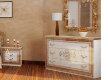По бокам кровати находятся закрытые прикроватные тумбочки, которые имеют ящики для хранения разнообразных предметов. Комод с тремя ящиками и шкаф с тремя дверями вместе с зеркалом позволяют организовать хранение вашей одежды и личных вещей в наиболее эстетическом и функциональном способе.