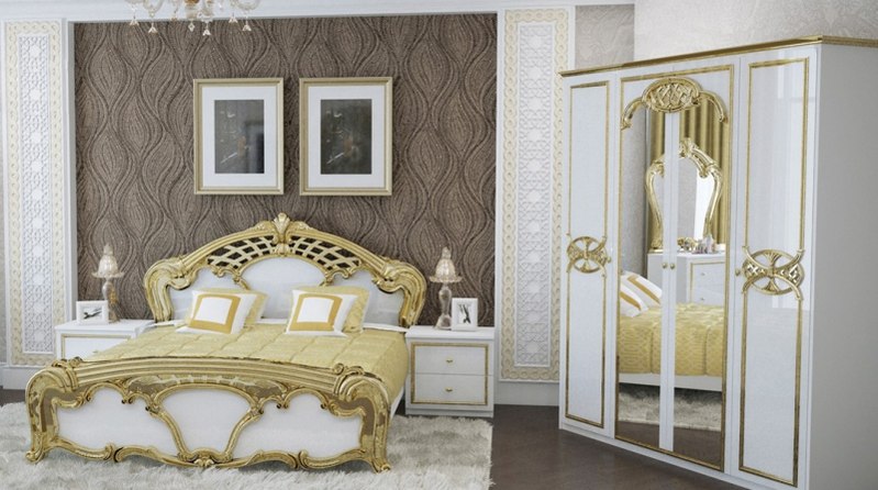 Кровать комплектуется буковыми ламелями шириной 53 мм и толщиной 8 мм на выборном деревянном или металлическом каркасе, что придает стабильности и долговечности. Доступно в двух цветах: белый глянец с золотистыми вставками и черный глянец, придающий элегантность и роскошь.