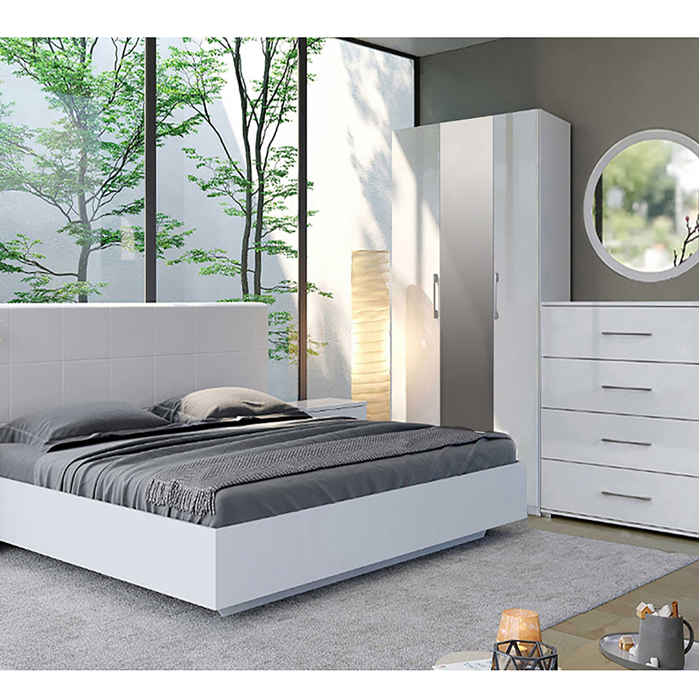 Фасады кровати выполнены из ЛДСП и зеркал, что придает им высокий глянец и элегантный вид. Белый глянец добавляет светлые и создает ощущение пространства в спальне. Мягкое изголовье выполнено из экокожи, предоставляя кровати дополнительный комфорт и стиль.