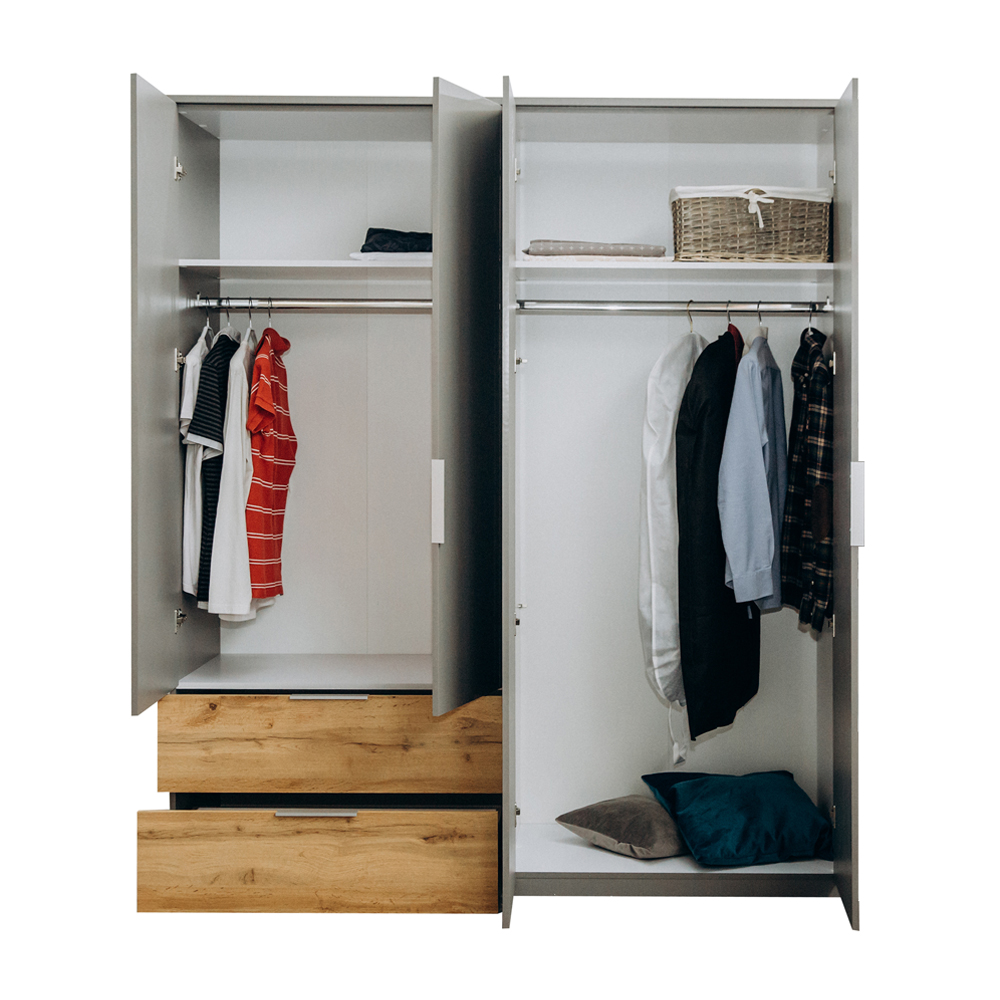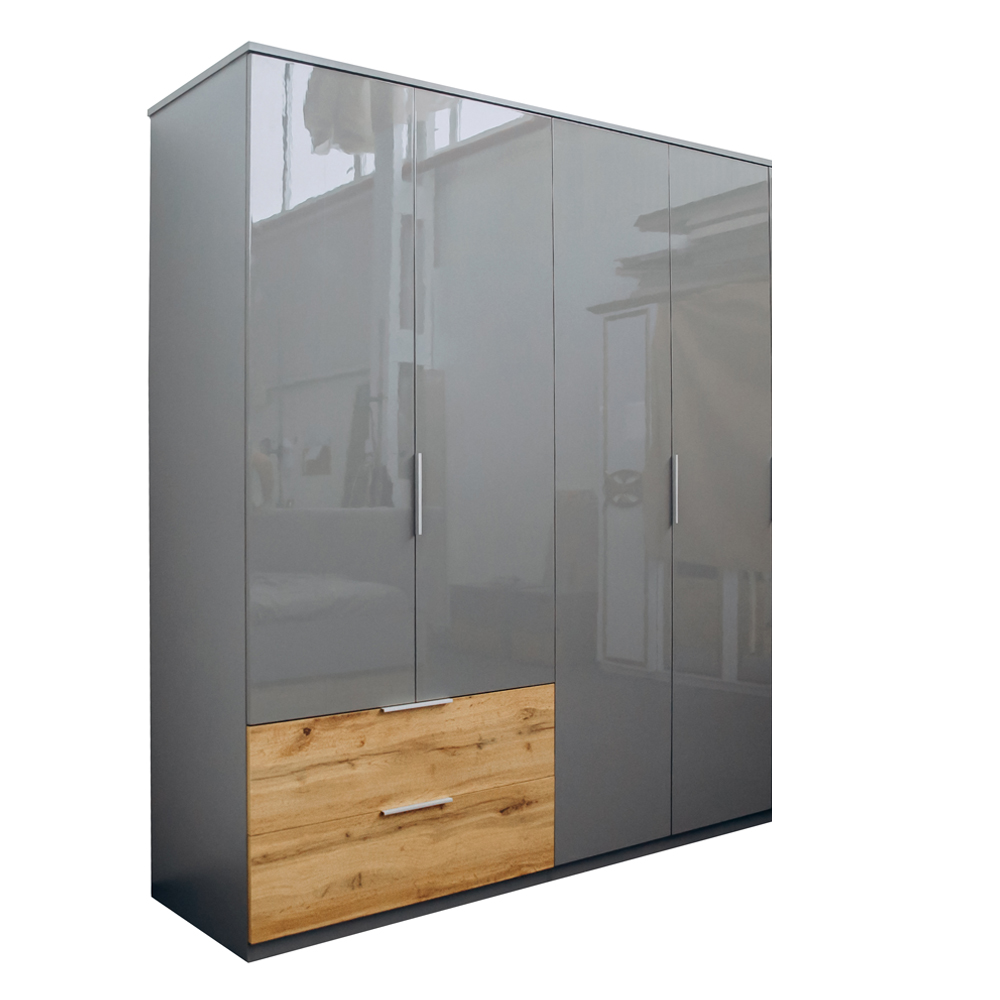 Этот комплект имеет четыре двери ДСП, обеспечивающие легкий доступ, и включает в себя зеркало, расширяющее пространство комнаты. Комплект поставляется с двумя тумбочками, где каждый имеет по два ящика, с фурнитурой от алюминиевого профиля и пластиковой ножкой, покрытой сатином.