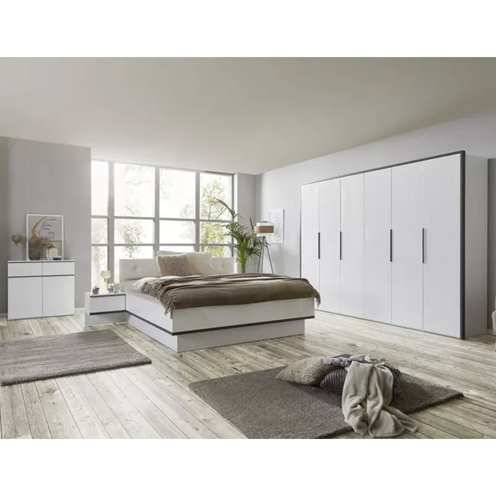 | Особенности | Корпуса шкафа, комода и тумбы Ламинированная ДСП 16 мм. Фасады Трехслойное высокоглянцевое покрытие, высушенное под ультрафиолетовыми лучами. ДСП ламинированная 18 мм. Кровать комплектуется металлическим каркасом с шагом ламелей 65 мм. |