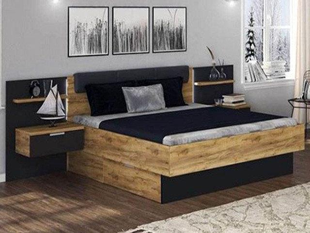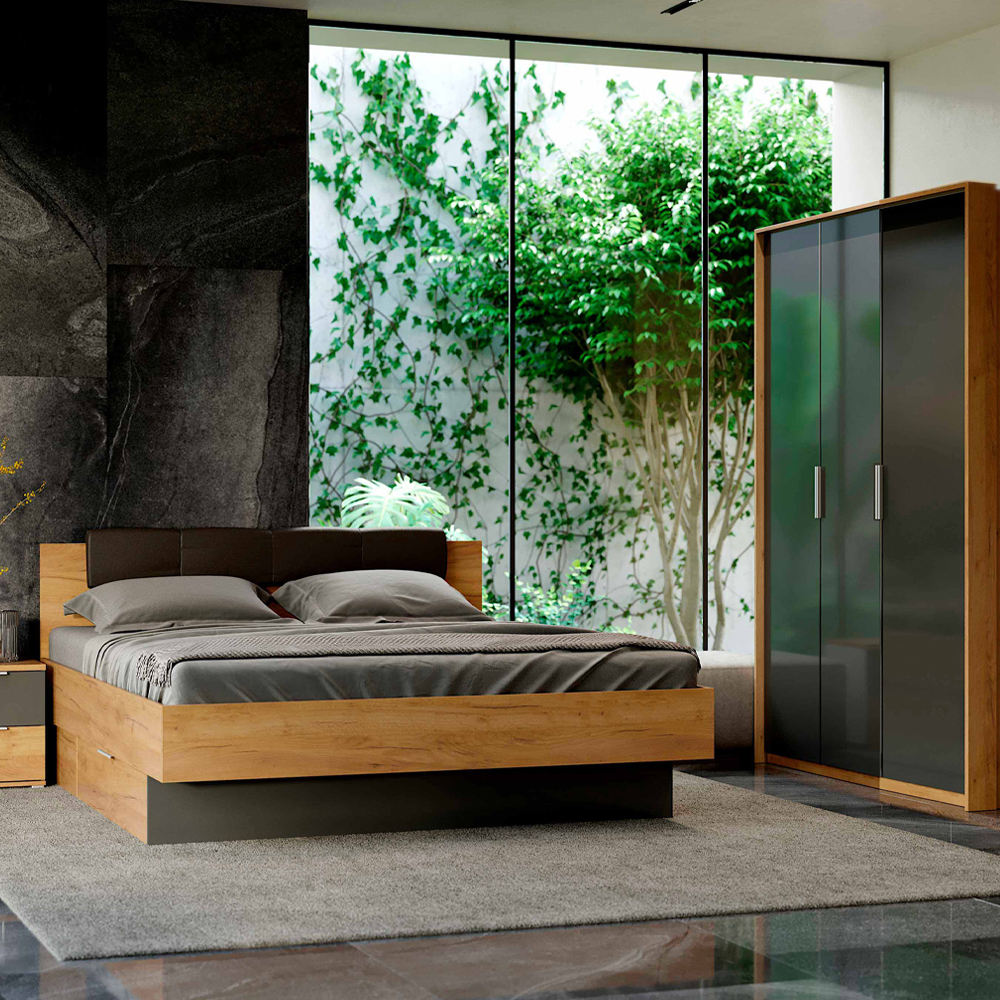Эта спальня имеет цвет Дуб Крафт – Мат Лава, придающий помещению изысканность и тепло. Корпуса шкафа, кровати, комодов и тумб сделаны из ламинированной ДСП толщиной 16 мм, тогда как фасады имеют высокоглянцевое трехслойное покрытие, что обеспечивает им эффектное сияние.