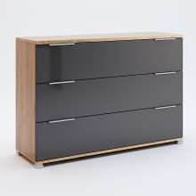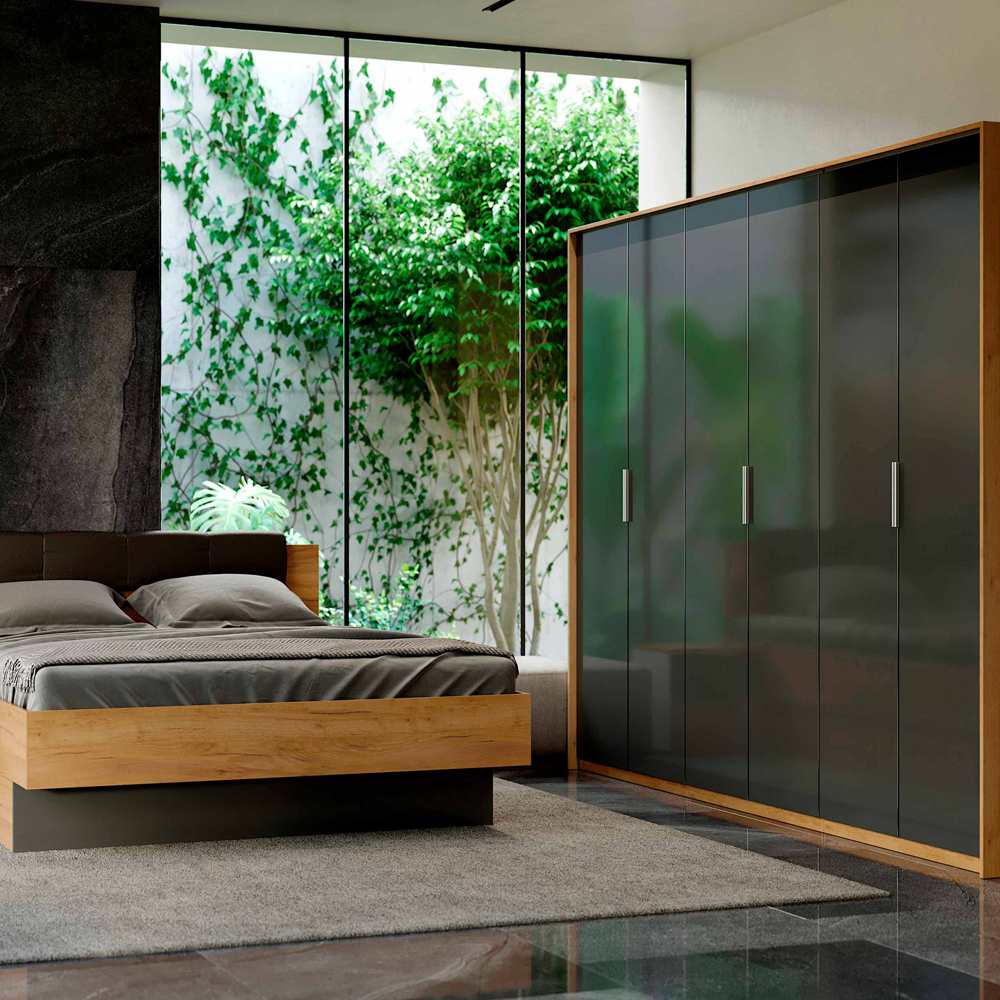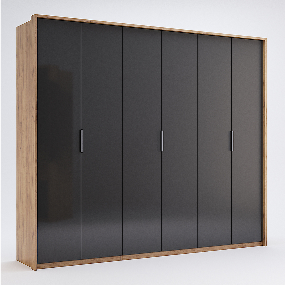 Шесть дверей из ДСП создают уютную атмосферу и обеспечивают удобный доступ к содержимому. Цвет Дуб Крафт – Мат Лава придает современный оттенок и создает атмосферу тепла. Зеркало, входящее в комплект, расширяет пространство и добавляет светлости.