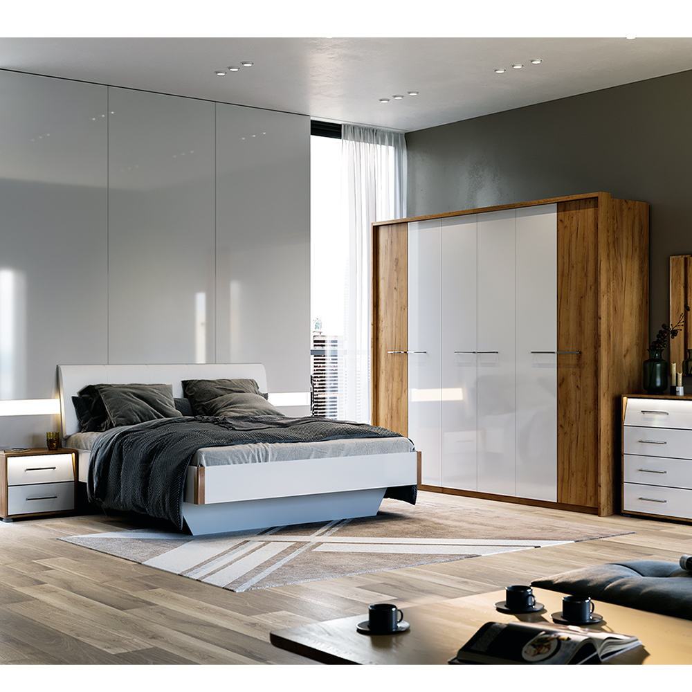 Корпуса выполнены из ДСП ламинированной плиты 16 мм, а фасады имеют трехслойное высокоглянцевое покрытие. Дополнительный акцент – цветовое исполнение фасадов и корпуса в виде дуба крафт в сочетании с белым глянцем.