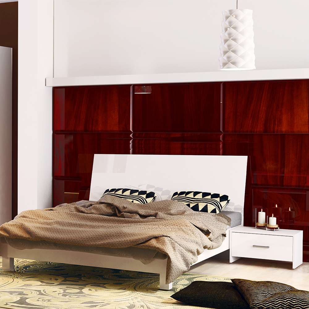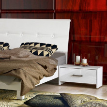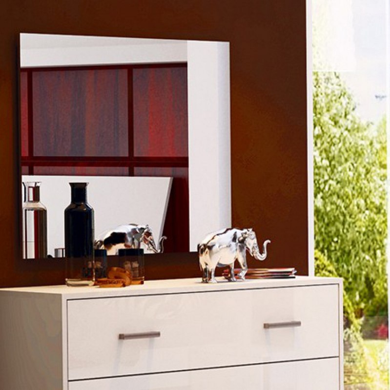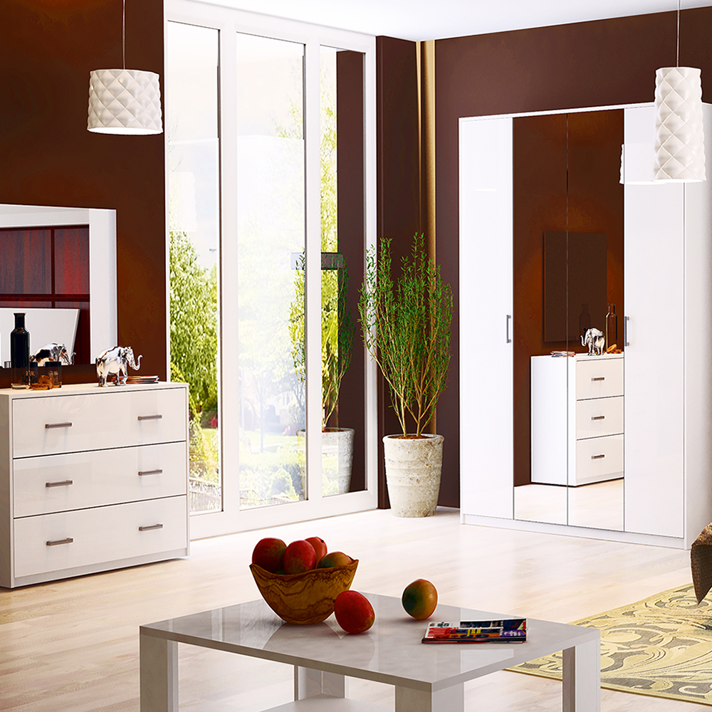 Кровать имеет фасады из ламинированной ДСП и стекла, что придает простору и ощущение пространства в спальне. Высококачественное высокоглянцевое покрытие устойчиво к износу и придает элегантный вид. Зеркала с фацетом и евролавкой придают шарму интерьеру.