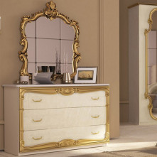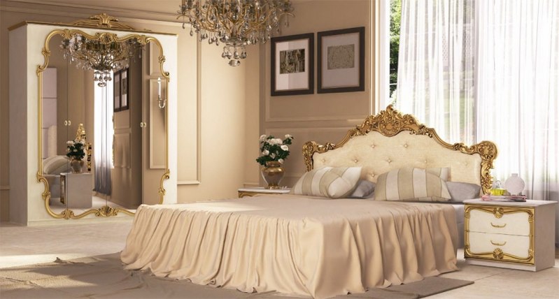Стиль спальни – классический, подчеркивающий его элегантность и безвременье. Комоды и тумбы с ящиками позволяют удобно организовать пространство и сохранить бытовые вещи. Зеркало, входя в комплект, придает ощущение пространства и света помещению.