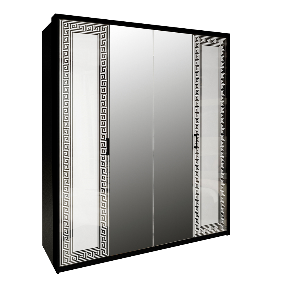 Этот набор включает в себя шкаф с четырьмя дверями и зеркалом, комод и две закрытые тумбочки с ящиками, что позволяет эффективно использовать пространство и обеспечить место для хранения вещей и предметов.