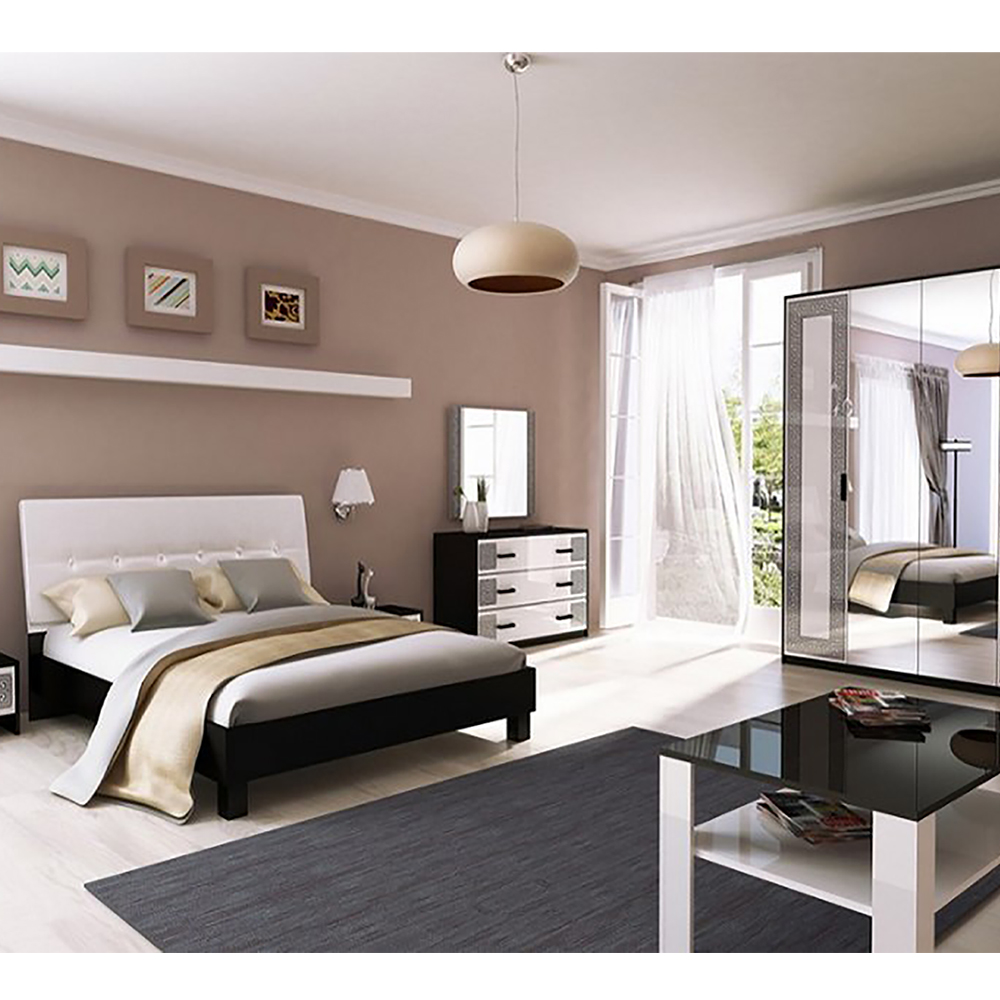 В комплект также входит шкаф с шестью дверями и зеркалом, который обеспечит достаточное место для хранения одежды и различных вещей. Кроме того, комод и две закрытые тумбочки с ящиками позволят организовать хранение вещей и придать дополнительную функциональность помещению.