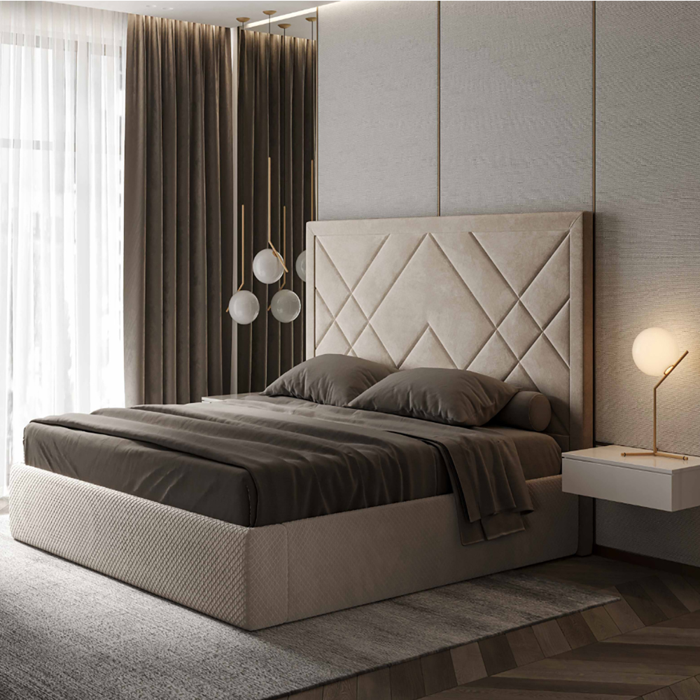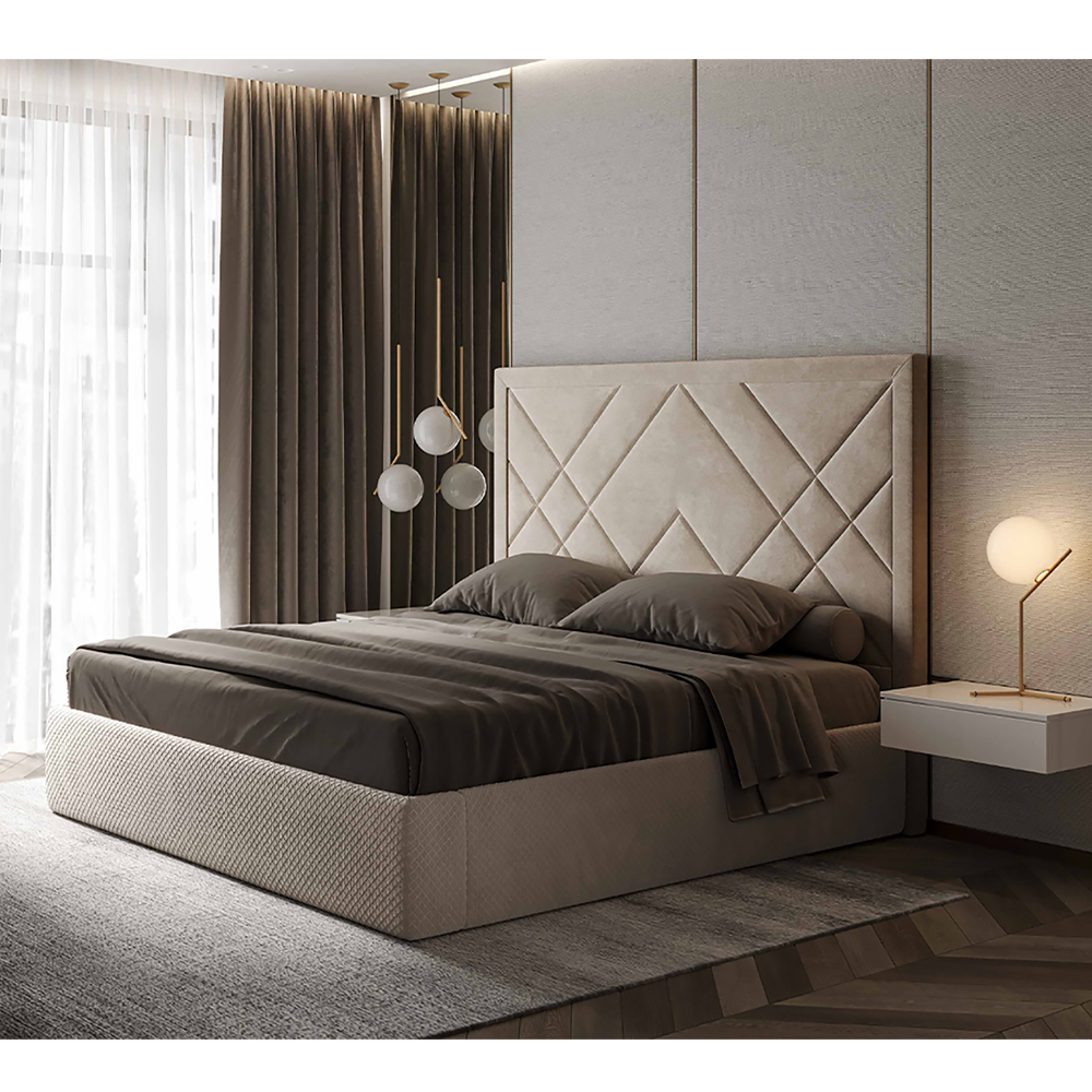 Эта спальня имеет светло-бежевый велюровый цвет и белый глянец корпусов и фасадов, что придает помещению светлость и уют. В комплект входит тумба, столик из ламинированной ДСП 16 мм и фасадами с трехслойным высокоглянцевым покрытием. Особенности кровати и мебели постоянно подчеркивают современный стиль и комфорт.