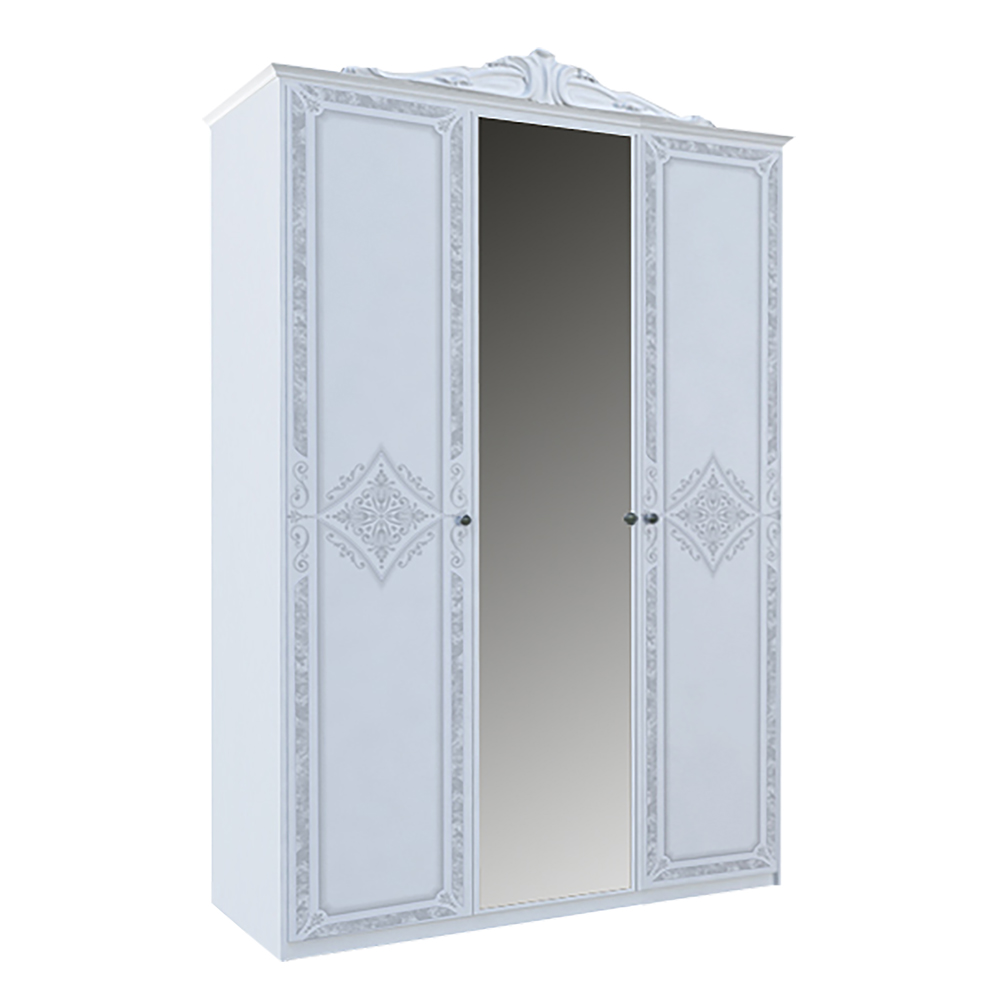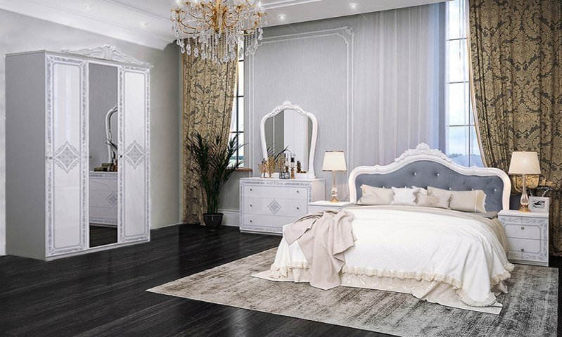 Шкаф имеет зеркало с полиуретановой рамой, а металлические фиксирующие полкодержатели обеспечивают надежность и долговечность. Классический стиль спальни подчеркнет ваш вкус и создаст ощущение уюта и роскоши. В комплекте матрас не входит, его следует купить отдельно.