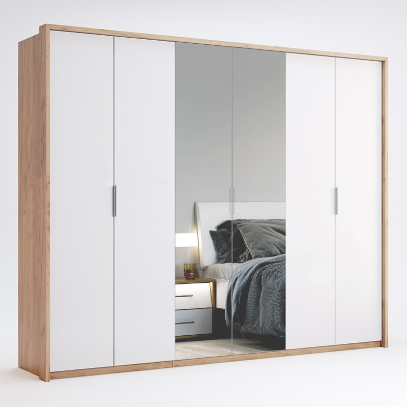 Шкаф Асти 6Дв MiroMark для гостиной или спальни изготовлен из высококачественного материала – ламинированного ДСП. Высота шкафа составляет 2132 мм, ширина – 2742 мм, глубина – 582 мм. Шкаф имеет шесть дверей с разными вариантами оформления - две двери из ДСП, две из ДСП с зеркалами и две с зеркалами. Дверь декорирована алюминиевой профильной ручкой, что придает шику и комфорту при использовании.