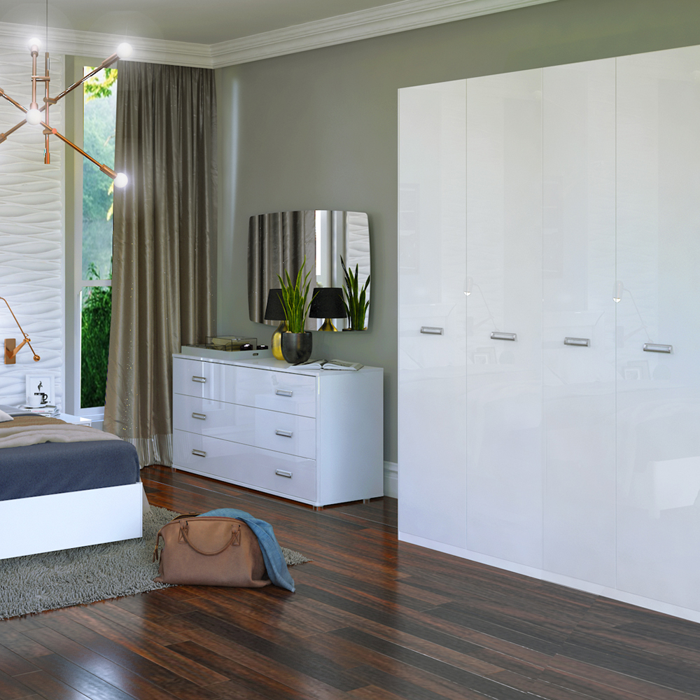 Шкаф доступен в глянцевом белом цвете, который добавляет визуальное пространство и светлость в интерьере.