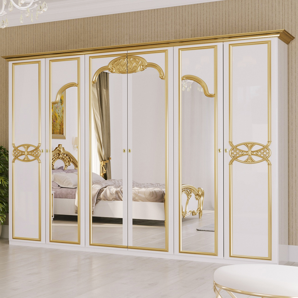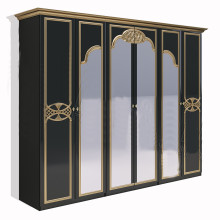 Шкаф доступен в разнообразных цветах, в частности в белом глянцевом – золотом или черном глянцевом. Страна изготовления – Украина. Ширина шкафа составляет 2814 мм, что позволяет вместить в него большое количество вещей.