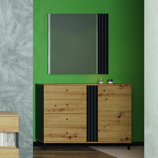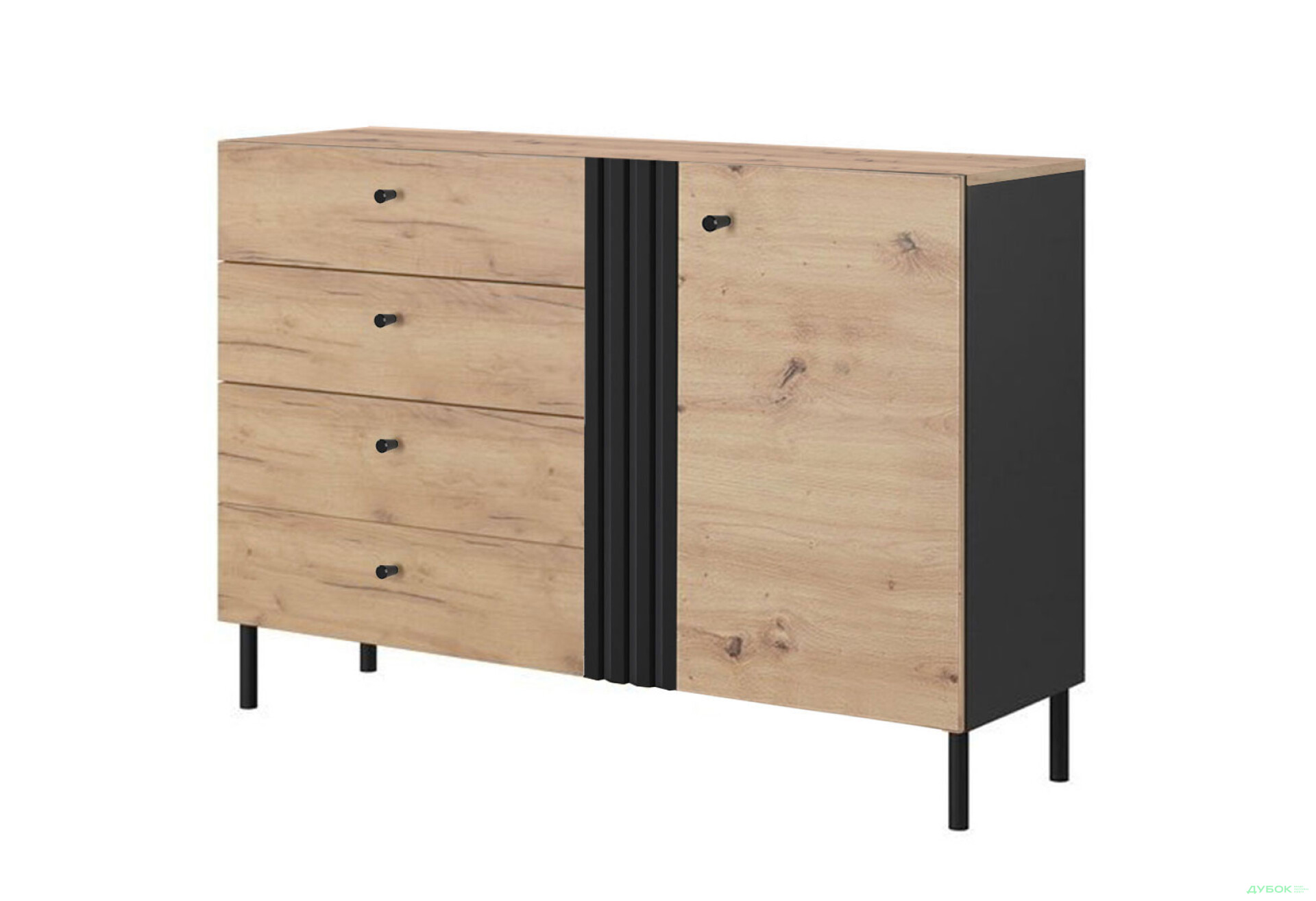 Комод Тео 1Д4Ш имеет одну дверцу и четыре выдвижных ящика, что делает его идеальным для хранения разнообразных предметов упорядоченно и удобно. Большое количество ящиков позволяет распределить вещи по категориям, облегчая их поиск и организацию, тогда как дверцы придают возможность хранения больших или менее часто используемых предметов.