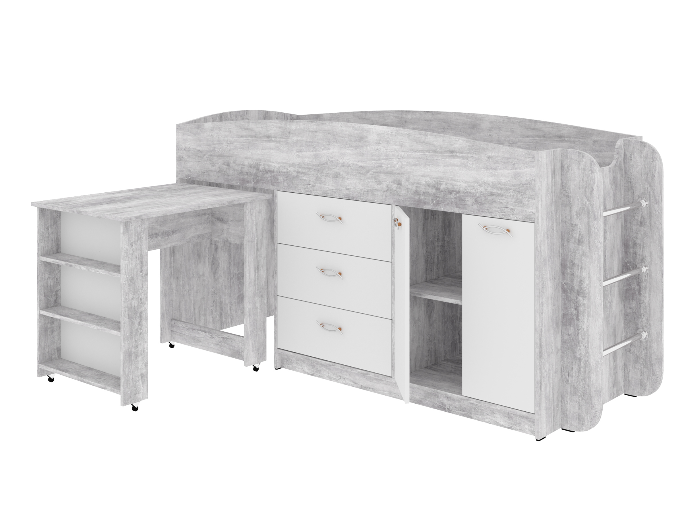 Эта кровать поражает своей функциональностью. Она включает в себя письменный стол на колесиках, который может легко сдвигаться под кровать для экономии пространства. Кроме того, вы получаете комод с тремя ящиками для хранения вещей и распашную тумбу с полкой внутри. Такой набор позволяет организовать зону для обучения, хранения одежды, книг, и даже декоративных предметов.