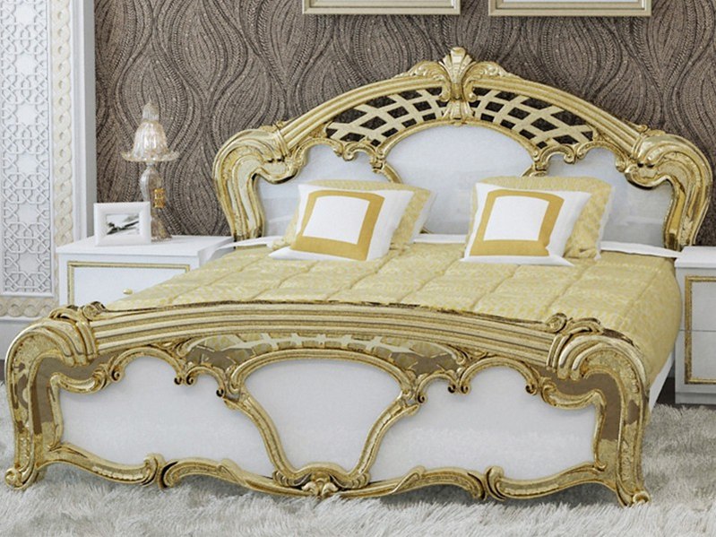 Высота задней спинки кровати составляет 520 мм, а общая высота с учетом изголовья составляет 1230 мм. Кровать доступна в белом глянцевом цвете с золотыми или черными вставками. Это создает элегантный и стильный вид.