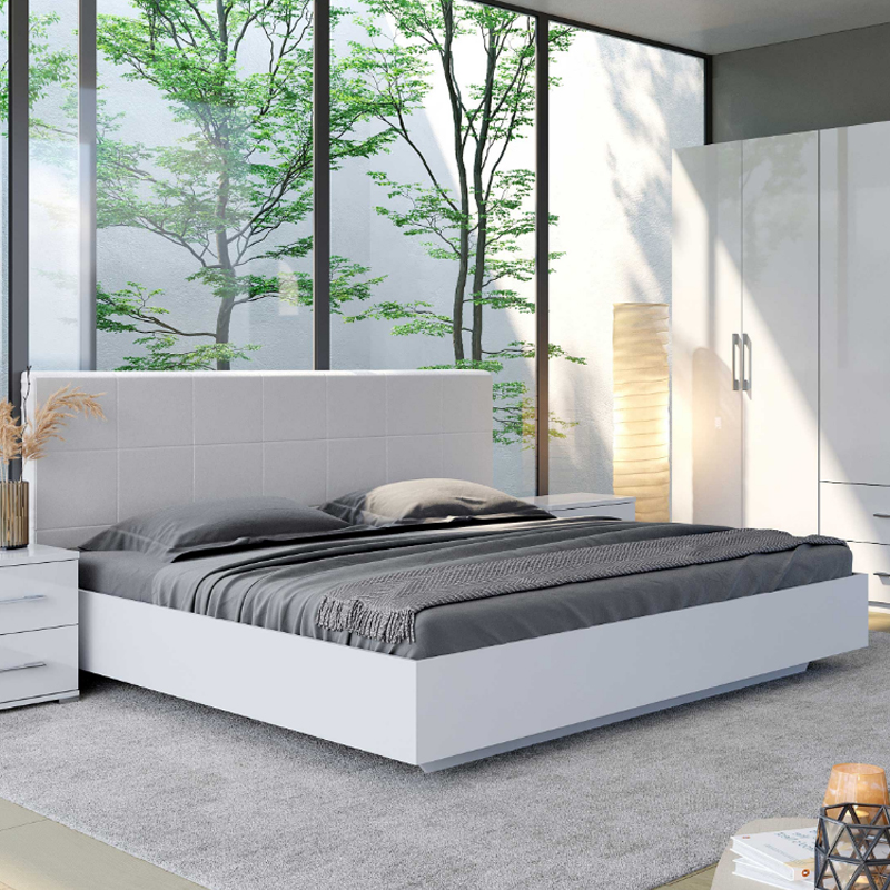 Кровать имеет белый глянцевый цвет, что делает элегантный вид. Корпус кровати изготовлен из ламинированной ДСП толщиной 18 мм, покрытой трехслойным высокоглянцевым покрытием, просушенным с помощью ультрафиолетовых лучей.