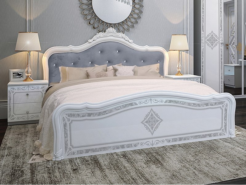 Кровать имеет стильный дизайн с белым глянцевым каркасом и светло-серой велюровой обивкой. Велюр – это высококачественный материал обивки, придающий мягкость и комфорт во время сидения или лежания на кровати. Изголовье кровати также выполнено в велюровом стиле, с использованием тканевой основы.