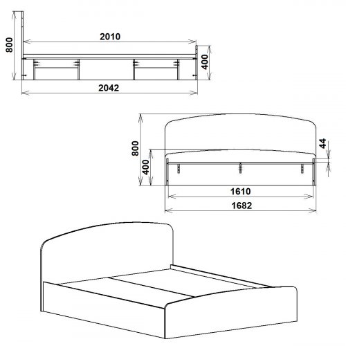 Общая высота кровати составляет 800 мм, с возможностью изменения на 300 мм, что позволяет вам настроить высоту кровати на свой вкус. Ширина кровати составляет 1682 мм, а глубина - 2042 мм. Большие размеры обеспечивают комфортное расположение на ней и удобный сон. Кровать изготовлена из высококачественного материала - МДФ (медиум-денсити фиберборд).