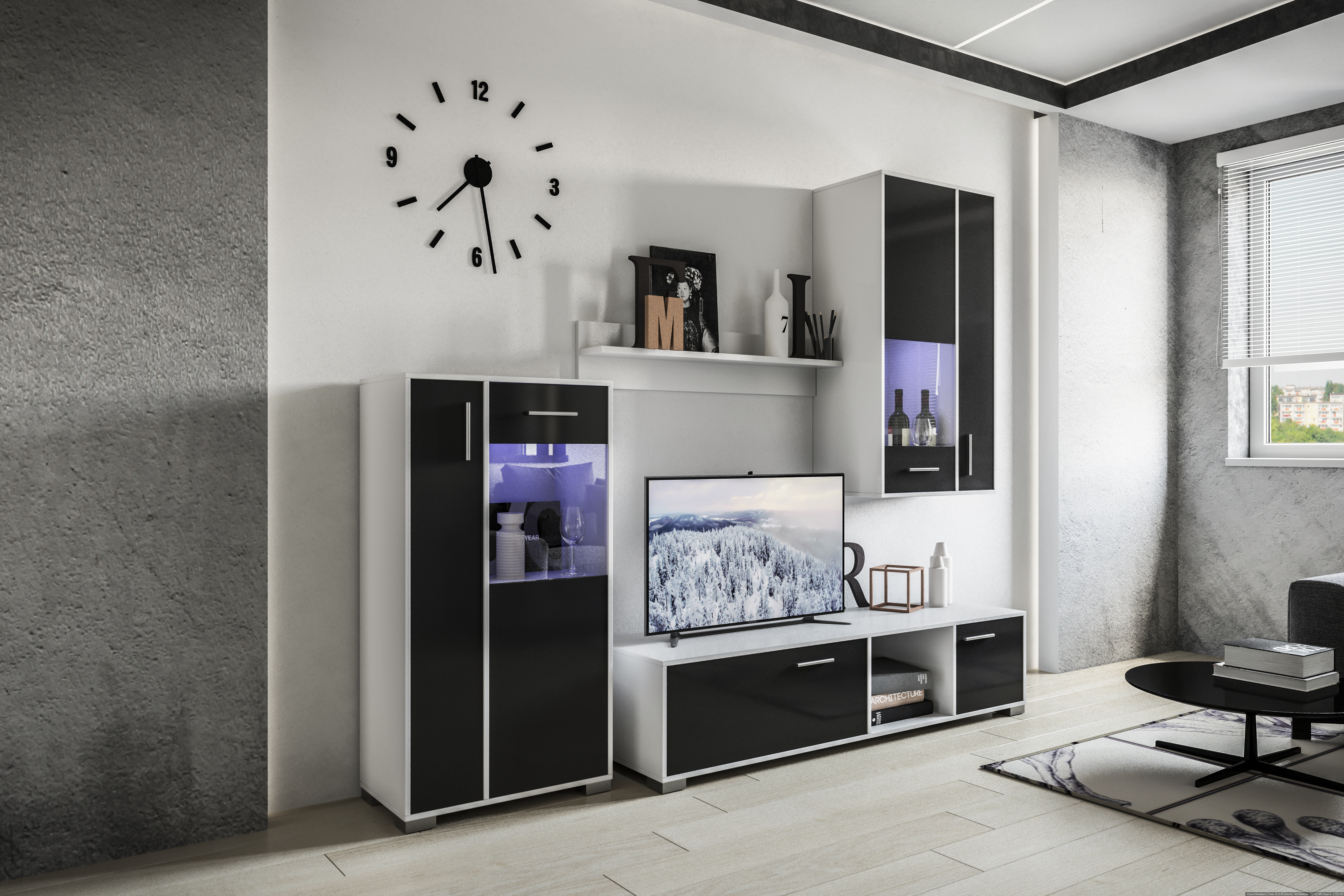 Корпус мебели изготовлен из высококачественного ДСП в белом цвете, что придает им легкость и свежесть. Фасады выполнены из ДСП в черном цвете с лаковым покрытием, создавая контрастный и стильный вид.