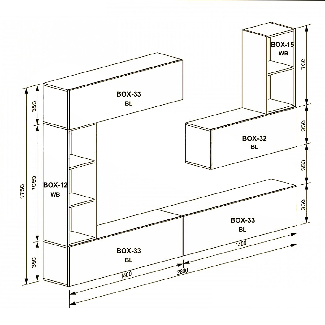 Гостиная BOX V3 MiroMark - это стильный и функциональный набор для вашего дома. Благодаря своей высоте в 2800 мм и глубине в 320 мм это решение идеально подходит для любого пространства.