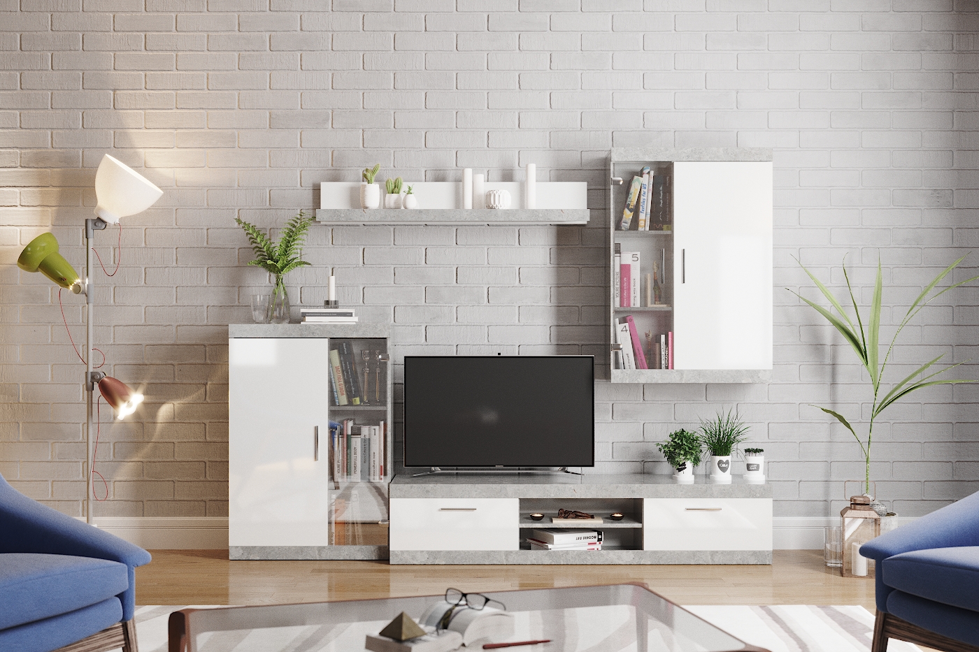 Корпус мебели выполнен из высококачественного ДСП в индастриальном стиле, а фасады покрыты белым лаком, придавая им элегантный и современный вид.