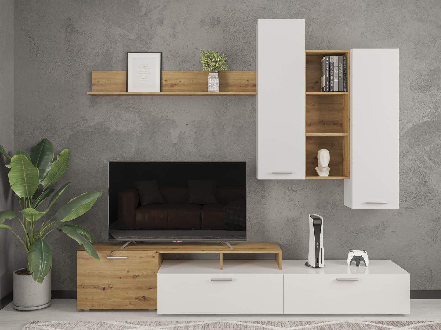 Корпус изготовлен из нимфеа альба и дуб крафт золотой (ДСП), а фасад имеет оттенок нимфеа альба, лак/дуб крафт золотой (ДСП), что придает гостиной элегантный и современный вид.