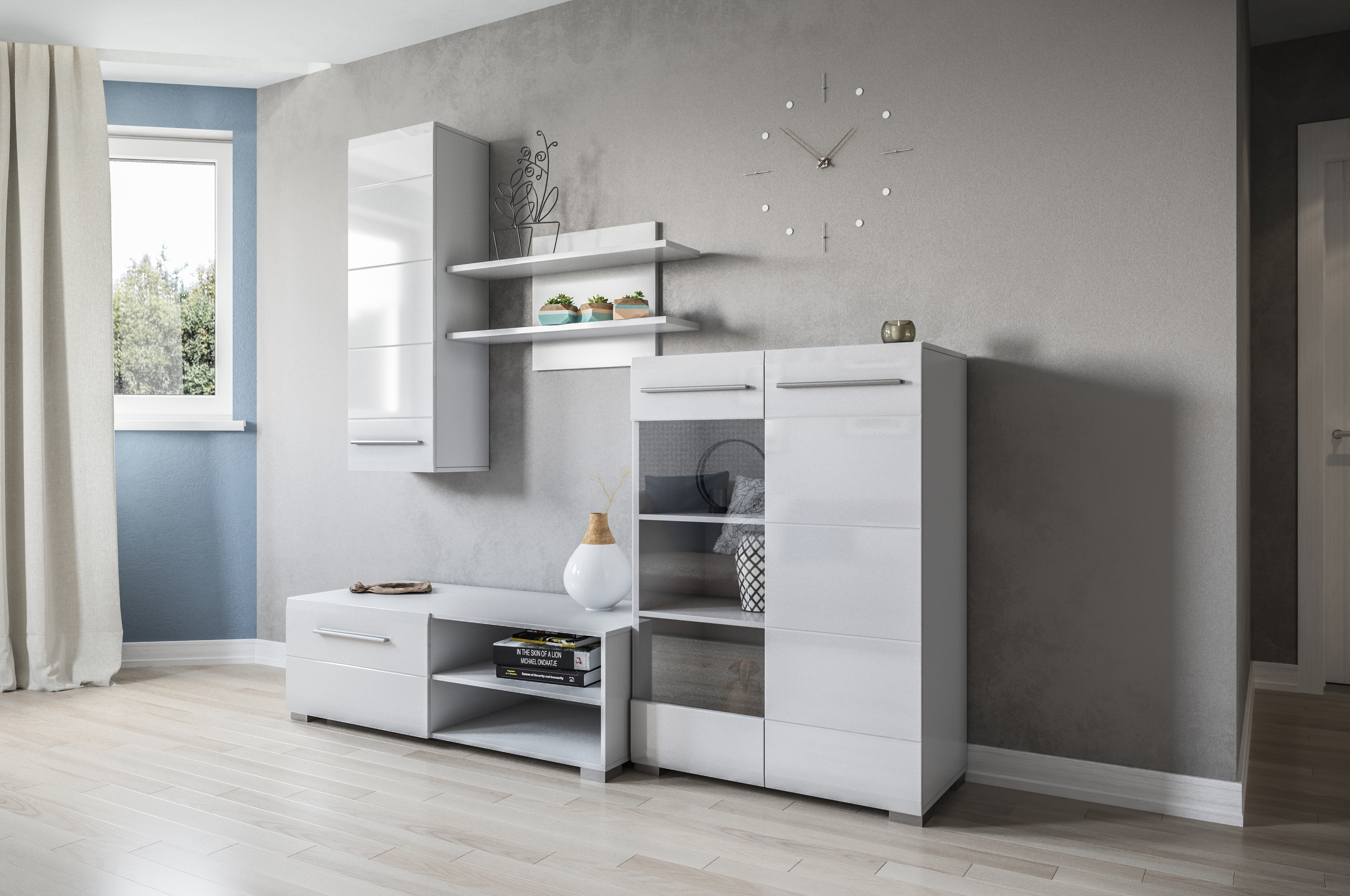 Корпус мебели выполнен из белого ДСП, а фасады покрыты белым глянцевым лаком, придавая им современный и элегантный вид.