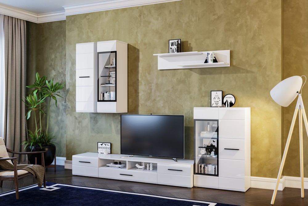 Корпус мебели выполнен из нимфеа альба (ДСП), а фасады покрыты белым глянцевым лаком, придавая им современный и элегантный вид.
