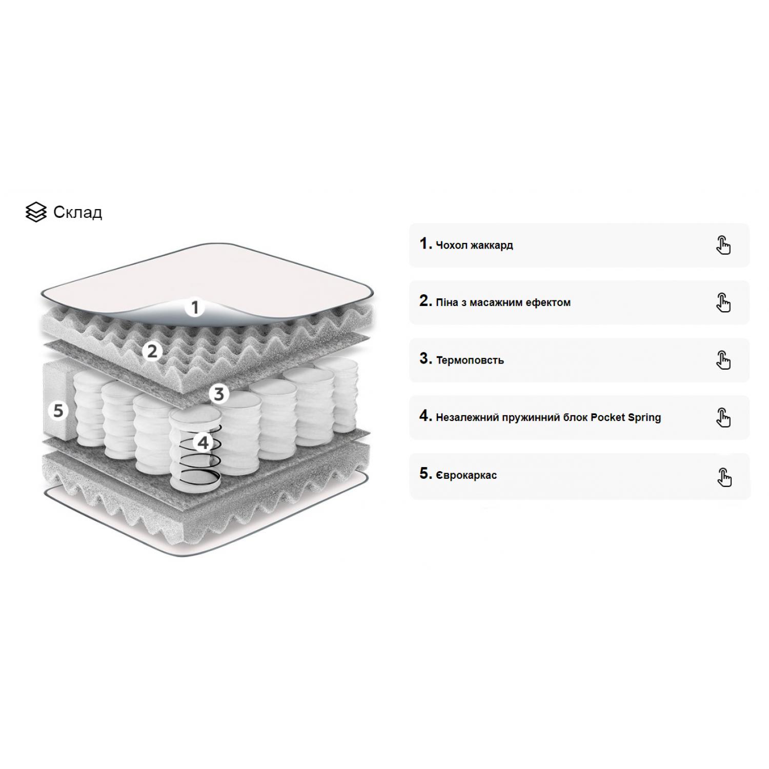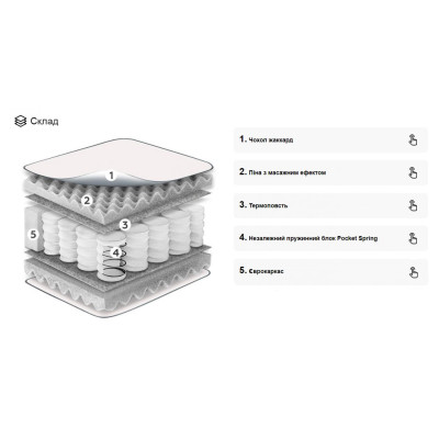 Чехол матраса изготовлен из качественной ткани жаккарда, которая влагостойка и обеспечивает защиту от пролитой жидкости. Кроме того, чехол съемный, что облегчает процесс чистки и ухода за матрасом.