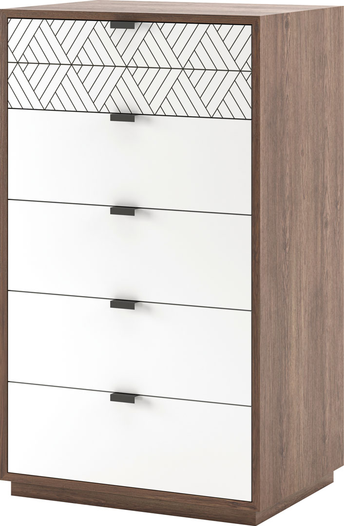 Он имеет пять широких ящиков, в которых можно хранить различные предметы и аксессуары. Дизайн комода выполнен в стильном и современном стиле, что позволяет легко вписать его в любой домашний интерьер.
